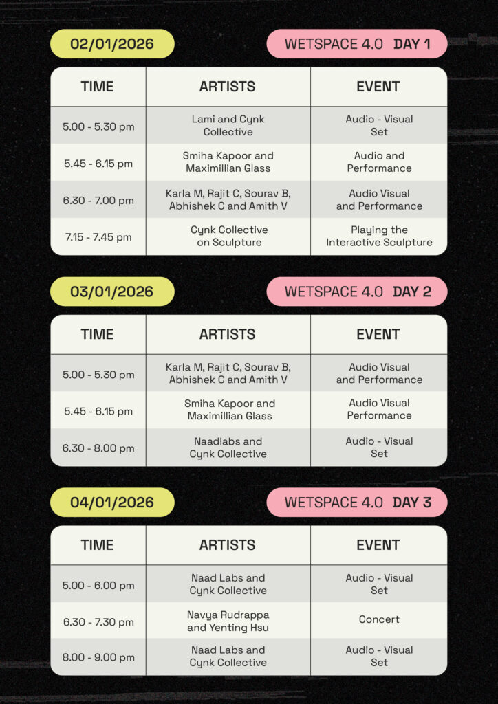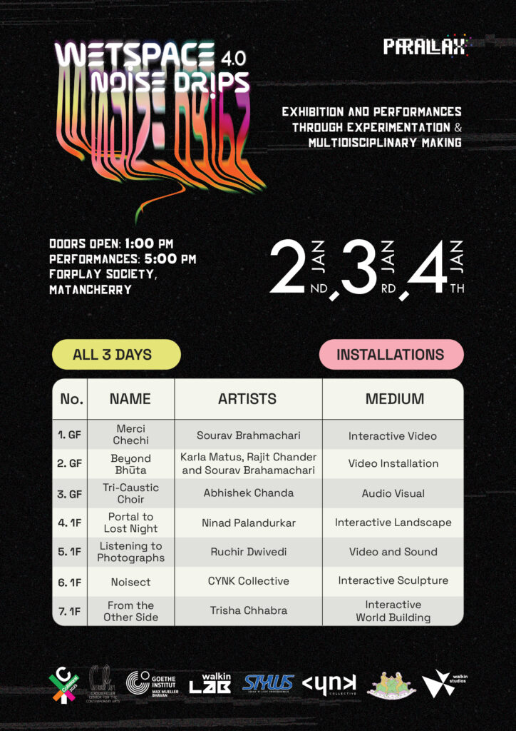 Wetspace Noise Drips 4.0 is the fourth iteration of an evolving platform dedicated to experimental sound, noise, and multichannel sonic practices hosted by Cynk Collective. Over the past three editions, Wetspace has grown through collaborative methods, testing, rehearsing, and shaping ideas collectively. This edition carries forward all those learnings, deepening the commitment to shared exploration and spatial sound-making. By setting up a multichannel system, we open a shared space where rehearsing, composing, and performing unfold fluidly. This year Wetspace 4.0 brings together artists working with DIY electronics, custom synthesizers, computer-based systems, site-responsive sound, cross-disciplinary performance, and photography.